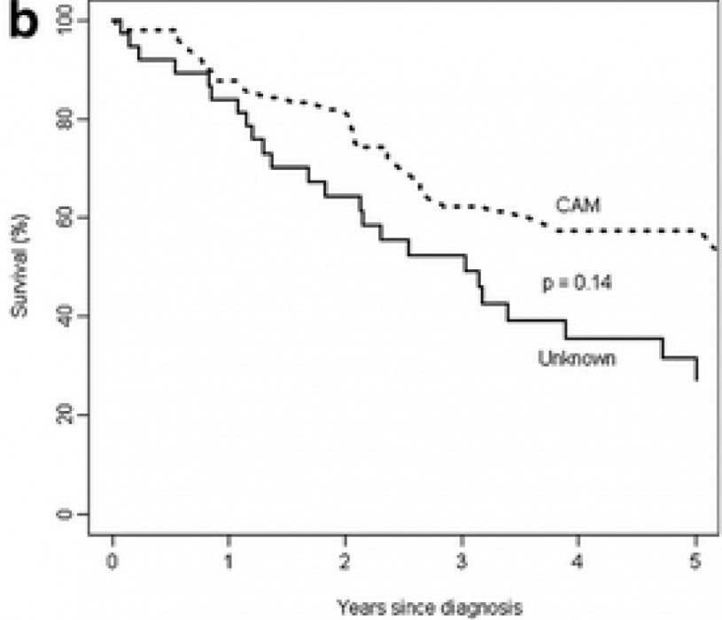 I could see CAM supporters grasping at this graph to argue that CAM has an effect on survival. That would be grasping indeed. First, the difference in breast cancer-specific survival is not statistically significant, although the difference in overall survival is. Second, we have no idea what the distribution of stages and other relevant tumor characteristics is. Are they well matched? Probably not, but we have no idea. We also need to remember that the “unknown” group is just that, unknown. We don’t know why these patients refused therapy, and we don’t know whether or not some of them underwent some form or other of CAM treatment. In other words, more than likely the two groups were not matched for some characteristic or other. Did some of the patients who refused all therapy do so because they were at a more advanced stage and, instead of trying alternative therapy, had decided to give up? We don’t know. Were the patients who refused all therapy older? Were they sicker and therefore more afraid of undergoing therapy? We don’t know.