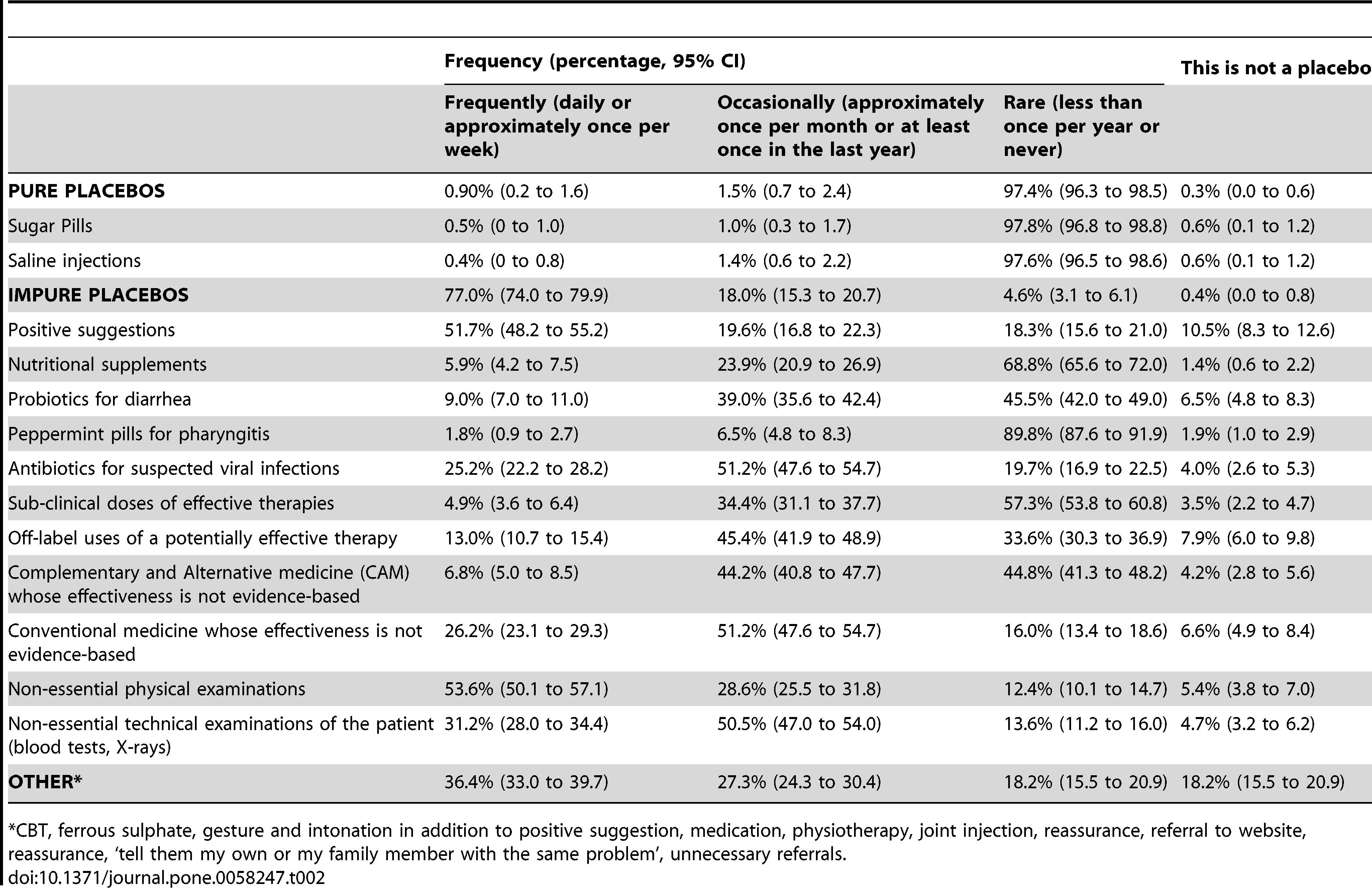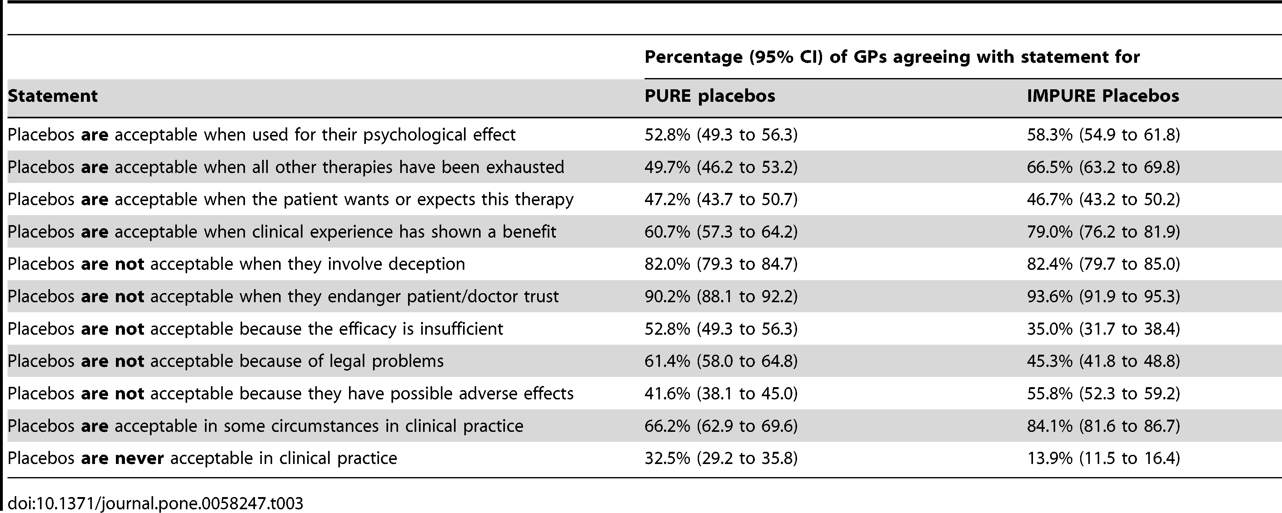 Howick J., Bishop F.L., Heneghan C., Wolstenholme J., Stevens S., Hobbs F.D.R., Lewith G. & Manchikanti L. (2013). Placebo Use in the United Kingdom: Results from a National Survey of Primary Care Practitioners, PLoS ONE, 8 (3) e58247. DOI: 10.1371/journal.pone.0058247.t003