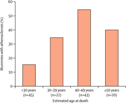 Probable or definite atherosclerosis was noted in 47 (34%) of 137 mummies and in all four geographical populations: 29 (38%) of 76 ancient Egyptians, 13 (25%) of 51 ancient Peruvians, two (40%) of five Ancestral Puebloans, and three (60%) of five Unangan hunter gatherers (p=NS). Atherosclerosis was present in the aorta in 28 (20%) mummies, iliac or femoral arteries in 25 (18%), popliteal or tibial arteries in 25 (18%), carotid arteries in 17 (12%), and coronary arteries in six (4%). Of the five vascular beds examined, atherosclerosis was present in one to two beds in 34 (25%) mummies, in three to four beds in 11 (8%), and in all five vascular beds in two (1%). Age at time of death was positively correlated with atherosclerosis (mean age at death was 43 [SD 10] years for mummies with atherosclerosis vs 32 [15] years for those without; p<0·0001) and with the number of arterial beds involved (mean age was 32 [SD 15] years for mummies with no atherosclerosis, 42 [10] years for those with atherosclerosis in one or two beds, and 44 [8] years for those with atherosclerosis in three to five beds; p<0·0001).