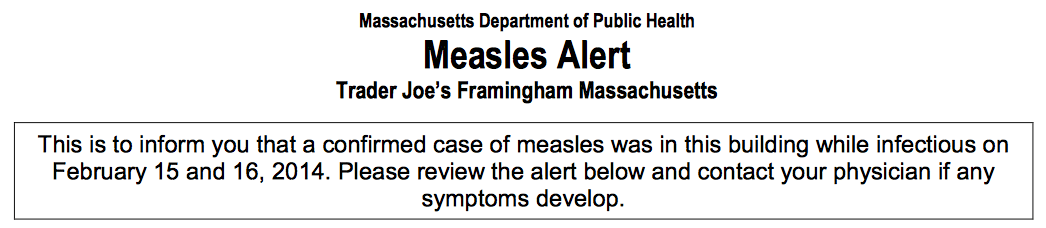 - Feb 24, 2014, Framingham, MA: two confirmed cases of measles potentially exposing many people at a Trader Joe’s, a local restaurant, a Bose Corporation office building, and a Harvard Vanguard medical clinic.
